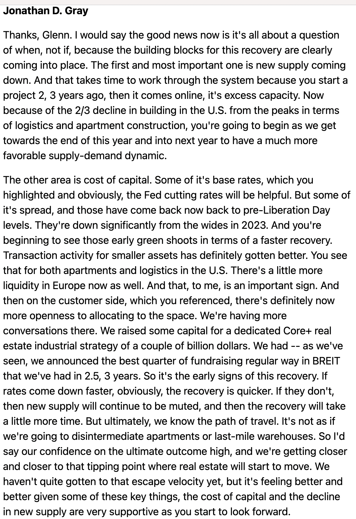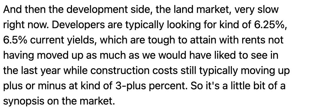 As go the assumptions used for in determining IRRs, I suspect the 3-4% NOI growth from 2027-2030 will prove conservative. As shown above, deliveries are set to fall off a cliff in 2026 and will likely remain low until 2029. Higher for longer interest rates coupled with challenged developer economics suggest that it could be awhile before we see a meaningful pickup in starts which could extend the period of above normal NOI growth.