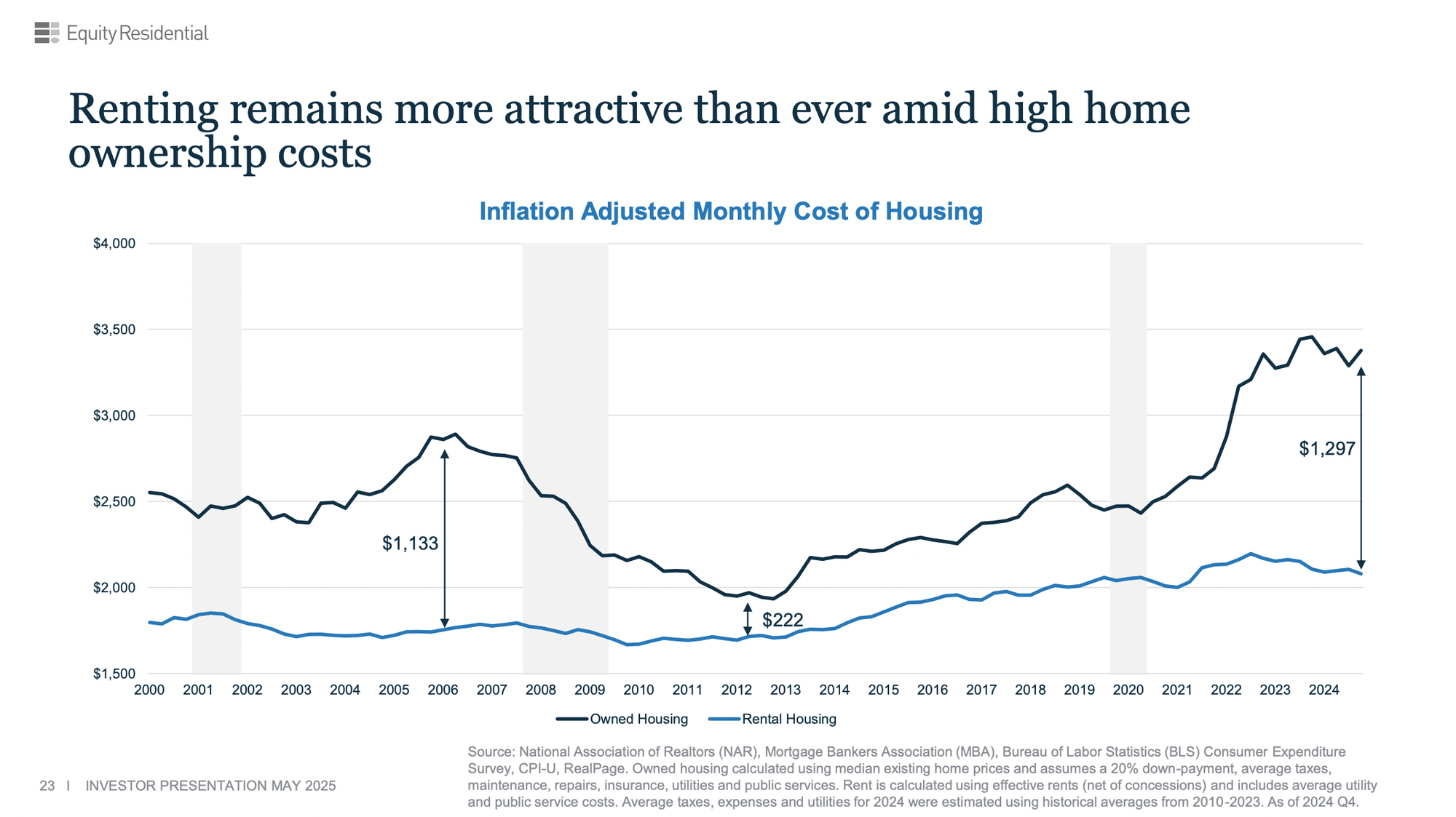 - Continued strength in renewals with resident retention continuing to hold at/near all-time highs. This despite the wall of supply which has plagued the sector over the past 2+ years). This is actually quite amazing - renters are seeing brand new buildings near by offering concessions (one month free!) and choosing to stay at their existing building despite a 4-5% rent increase. Part of the reason for this is the prohibitive cost of homeownership as shown below which has lead to more 'renters by necessity'.