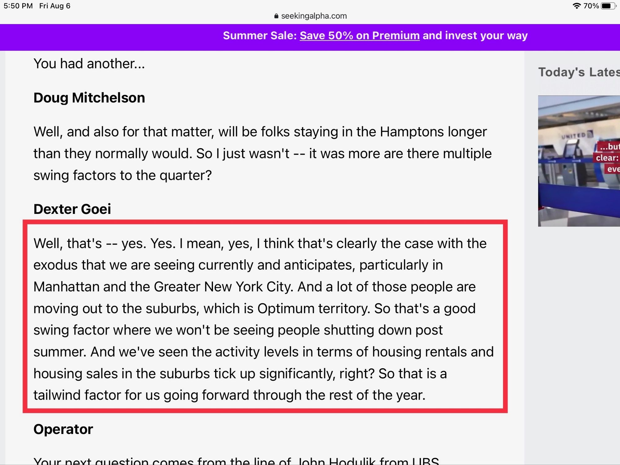 As pertains to the second quarter specifically, ATUS suffered a partial reversal of some of the pandemic induced NYC mass outmigration experienced in 2020. Unlike Charter, which is considerably larger than ATUS and geographically diversified, ~65% of ATUS's business (Optimum brand-> formerly the Cablevision assets) is concentrated in the areas surrounding NYC. While the 'Death of NYC' said everyone was moving to the sunbelt, having done considerable work on apartment REITs with exposure to the NY area, the reality was that: