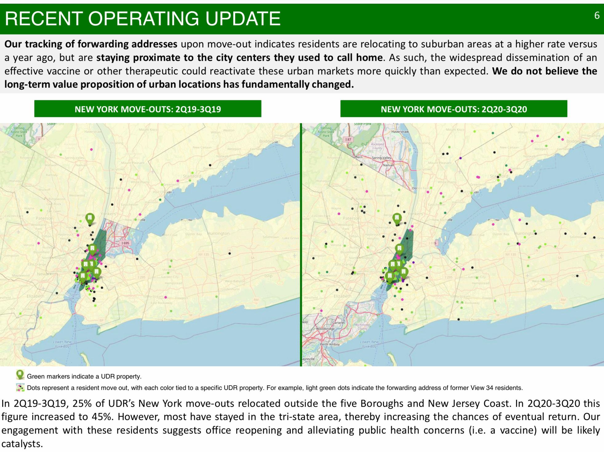 B) The COVID induced exodus of NYC was to ATUS's benefit in 2020- the company does not operate in NYC but has a strong market position in surrounding areas. ATUS reported record broadband subscriber additions in 2020, with 2Q20 being its best quarter as most of those fleeing NYC moved to surrounding areas. Recall the decline in apartment occupancy NYC focused apartment REITs experienced last year. It was truly unprecedented. Here is a slide from apartment REIT UDR last year showing NYC COVID refugees stayed close to home after fleeing the city in 2-3Q20: