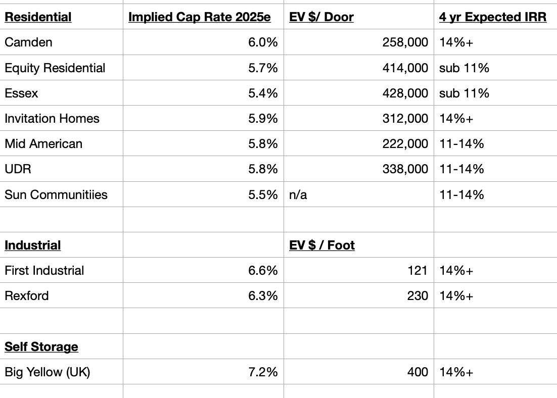 Cap Rates,EV per Door/Ft, Est IRRs for Selected REITs