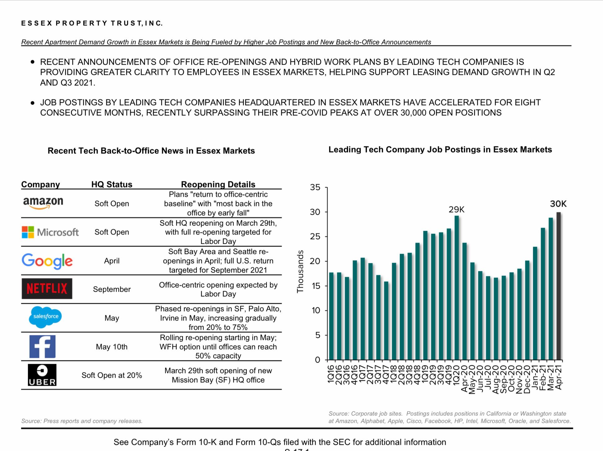 As the digital transition has accelerated since the onset of COVID, hiring in the tech space has surged. Similarly VCs are funding new tech companies at a record pace (most of whom are located on the left coast) creating new demand for office space. Management noted that leasing tour activity has picked up significantly with lease tour activity getting back to pre-COVID levels. On the call, management noted that asking rents aren't materially different than pre-COVID for Kilroy's well located Class A office space.