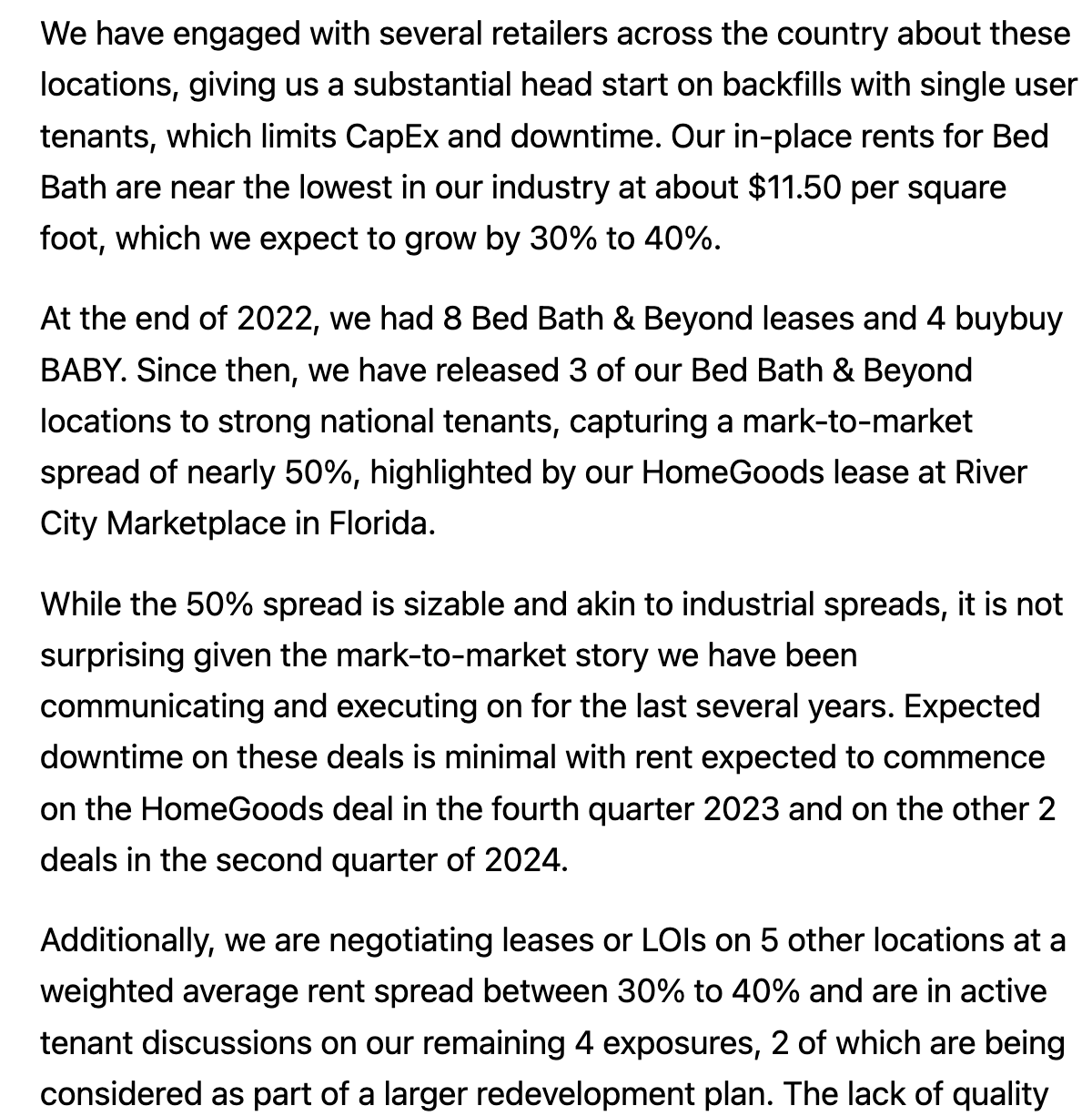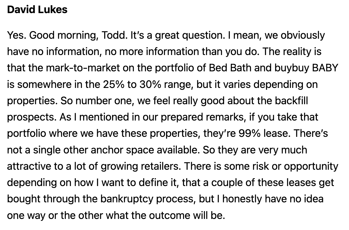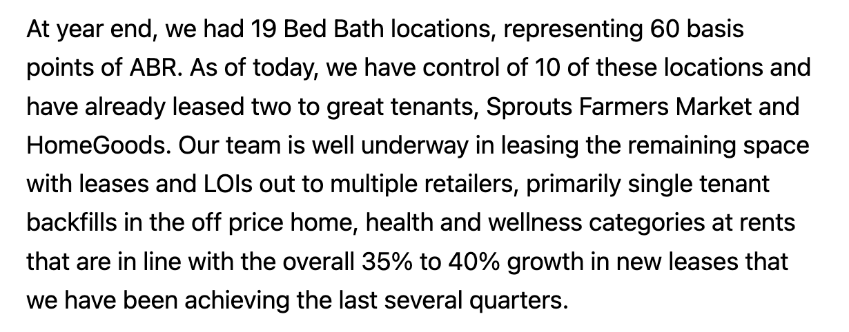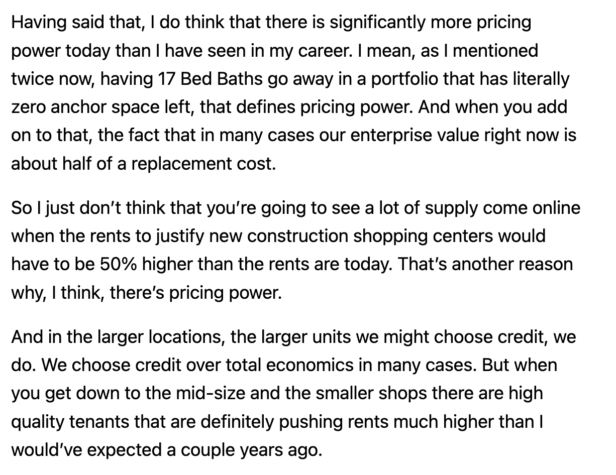The counterpoint here is that 1/ the gap between leased (vs physical) occupancy is at/near multiyear highs (reflective of large pipeline of leases signed where the tenant has not yet occupied the location -there tends to be a 12-24 month lag between the signing of a lease and physical occupancy) 2/ growing interest amongst leading retailers in maintaining/growing suburban shopping center footprint as a result of pandemic related shifts in shopping habits 3/ robust multiyear growth plans of healthy retailers/restaurants like TJX Companies, Ross Stores, Burlington, Five Below, Ulta, Chipotle, Starbucks, Sprouts, Aldi, Bath & Body Works, Academy Sports, Grocery Outlet, Publix, Floor and Decor, Bootbarn, Dutch Bros, Planet Fitness, BJ's, Shake Shack, Total Wine, Dave & Busters, Dollar General (including Popshelf), Bob's Furniture, among others.