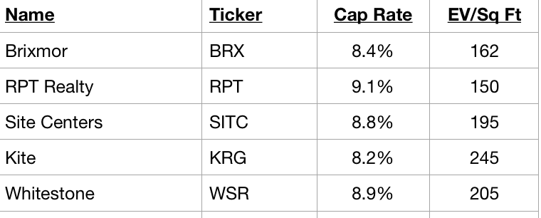 -Valuation - many shopping centers trade at attractive valuations as the positive attributes described above has failed to garner a rerating from investors. While Regency (REG), Kimco (KIM), Federal (FRT) trade inside of a 7 cap (Regency just acquired Urstadt Biddle (UBP) at a 7.2 cap/310 per ft), shopping centers REITs including Site Centers (SITC), Brixmor (BRX), RPT (RPT) and Whitestone (WSR), all of whom have undergone positive portfolio transformations over the past 6-7 years trade at discounted valuations: