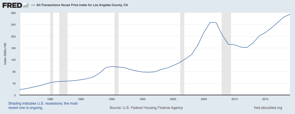 Local government policy, both restriction via of supply via strict zoning (municipal) and Prop 13 (state - which limits property tax hikes to 2% per year), have been incredibly successful in growing single family home property values in LA and SFs over the past 45 years, as shown below: