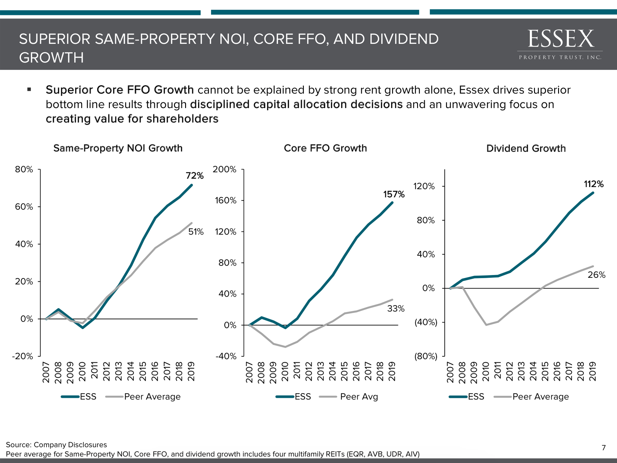 That's a 12 year same-property NOI CAGR of 4.6% for ESS vs. peers averaging in the mid 3s. Note that starting point incredibly ugly as 2007 is right before housing tanks - today's housing market is MUCH stronger as there has been a decade plus of under-building in sharp contrast rather than the mass overbuilding which lead up to the great financial crisis of 2008-09.