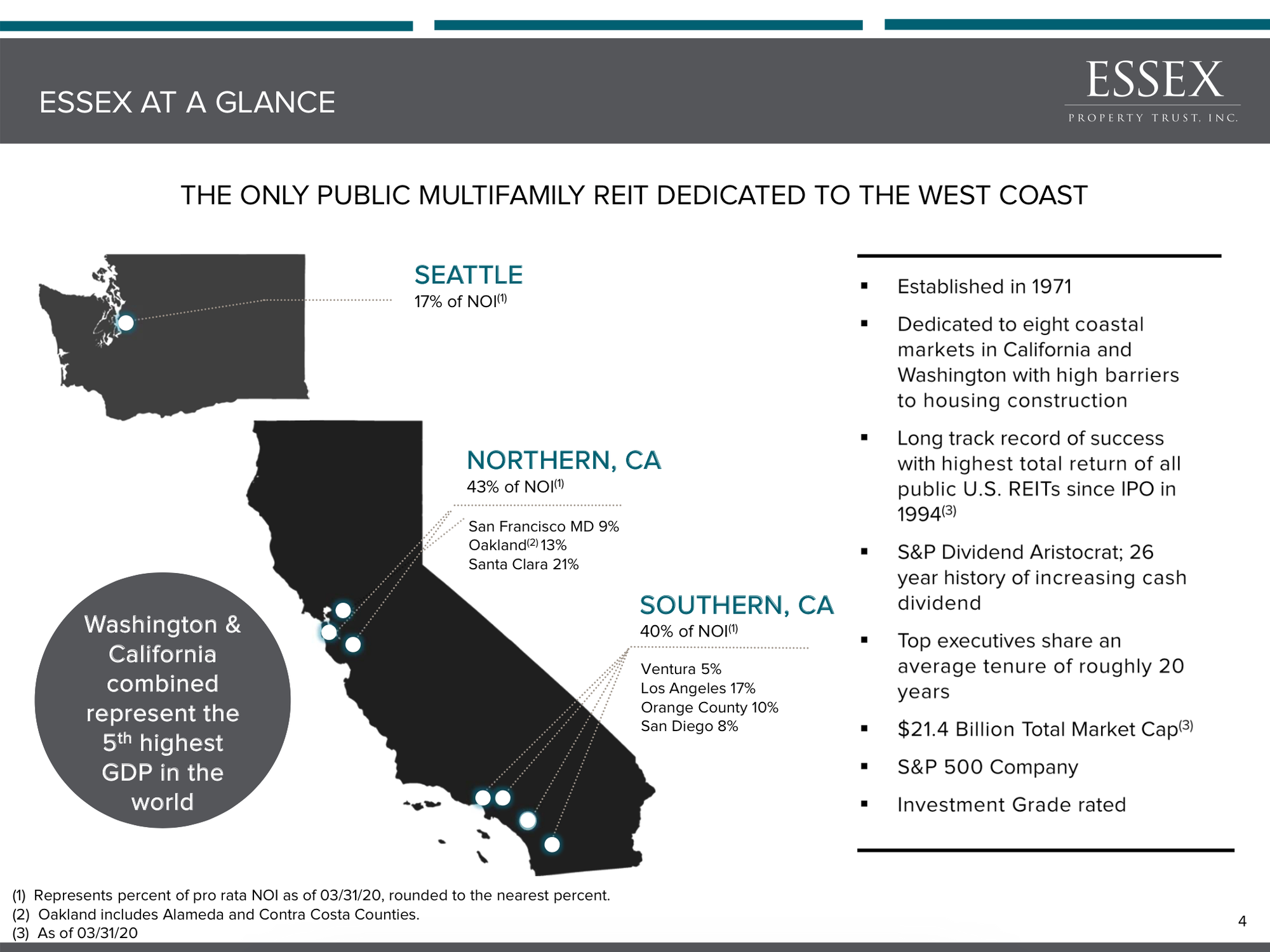 1) Pure play apartment REIT focused solely on the West Coast. Essex benefits greatly from the continued and unending growth of the tech sector in Silicon Valley/Seattle and the ongoing growth of the entertainment industry in LA.