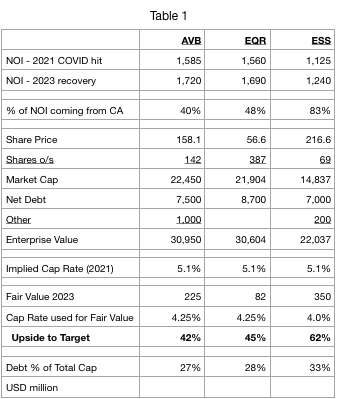 Because ESS operates only in supply constrained West Coast markets with incredible long term demand, I award it a lower cap rate than ascribed to AVB and EQR.